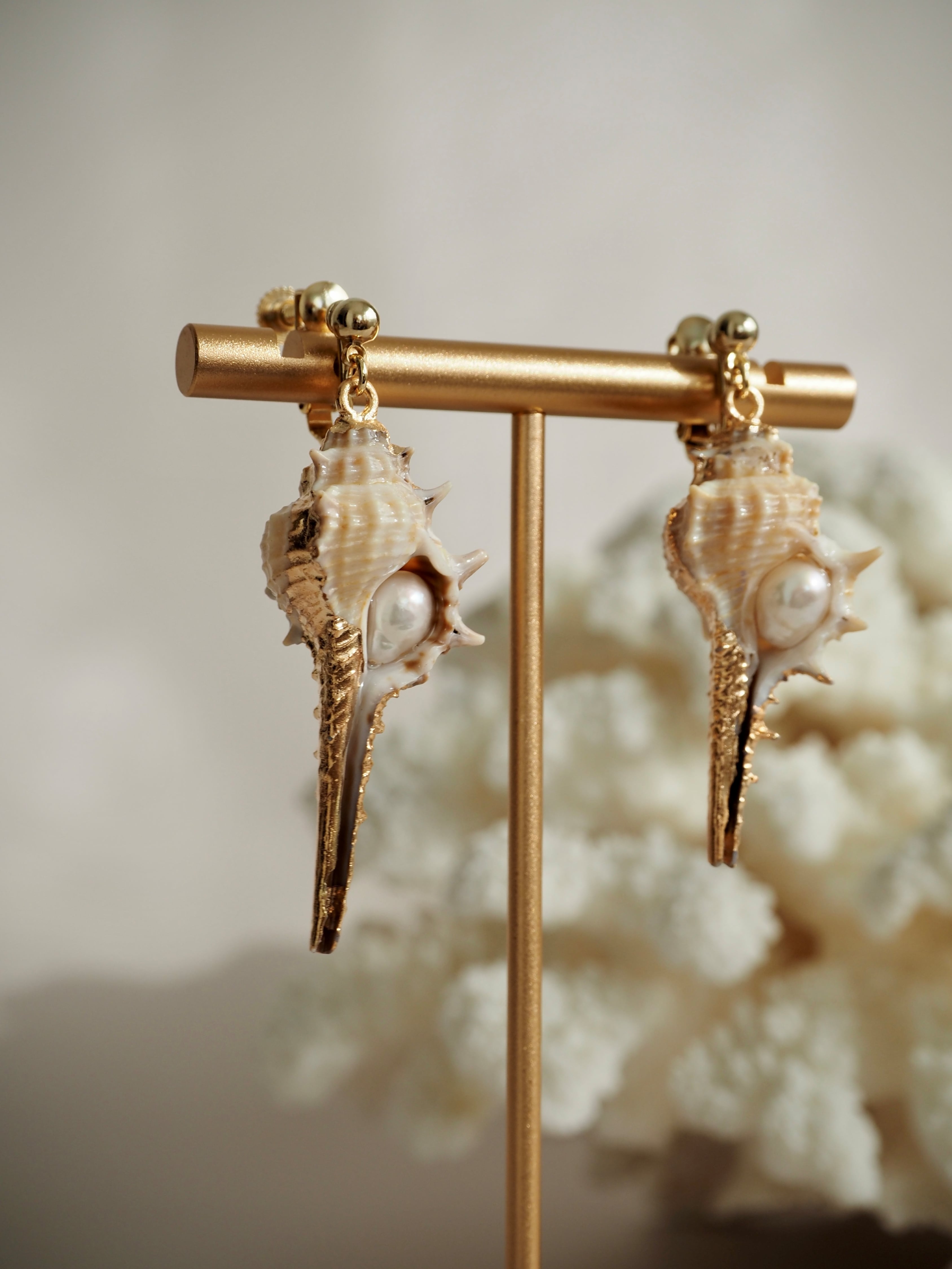 ※金具の種類(イヤリング、ピアス、チタンポスト)はオプションからお選びください。 貝ボタンの素材としても使われるタカセガイを使用した耳飾り。温かみのある艶やかな光沢が特徴です。 素材:タカセガイ、淡水パール、真鍮(18K金メッキ加工)、ガラス 学名:Tectus niloticus サイズ:縦 約20mm × 横 約10mm ※天然素材のため同じ形状、色味の物はありません。表情が異なっているのも魅力のひとつです。 ※模様や色味については当店のお任せになります。 ※モニターの関係や撮影時による光加減で、実物と画像の色合いが異なる場合があります。 ※ピアスは全ての方に無料でシリコンキャッチをお付けしております。金属キャッチを追加希望の方はオプションにてご選択ください。 □お手入れについて 貝殻の主成分は炭酸カルシウムです。酸によって溶けて表面が曇るなどの変化があるため、汗(弱酸性)が付着した際は水で優しく手洗いしてください。洗剤を使用する際は中性洗剤をご使用ください。 #フラワー