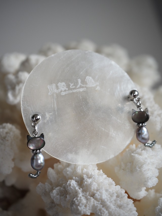 真珠玉乗りねこちゃん 耳飾り(シロチョウガイとクロチョウガイ)両耳セット