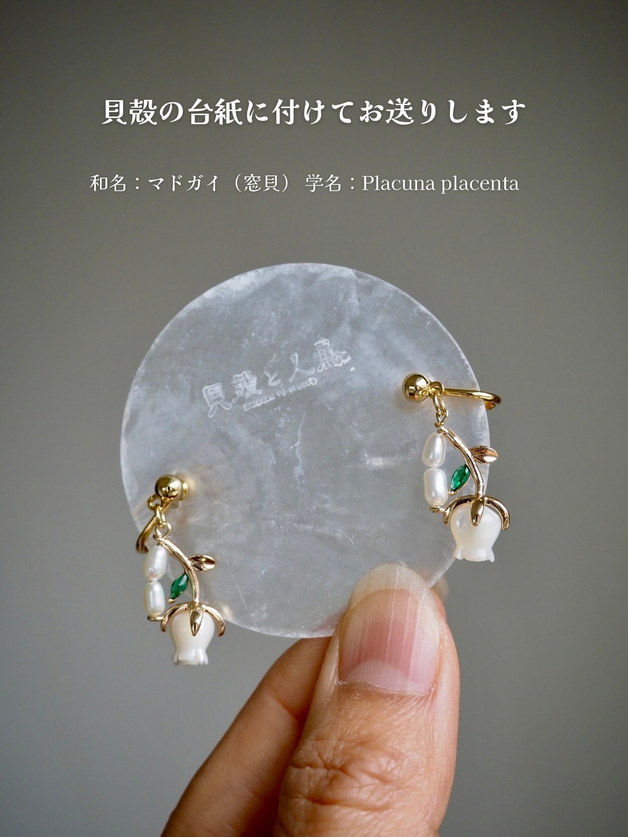貝ボタンの素材としても使われるタカセガイを使用した耳飾り。温かみのある艶やかな光沢が特徴です。