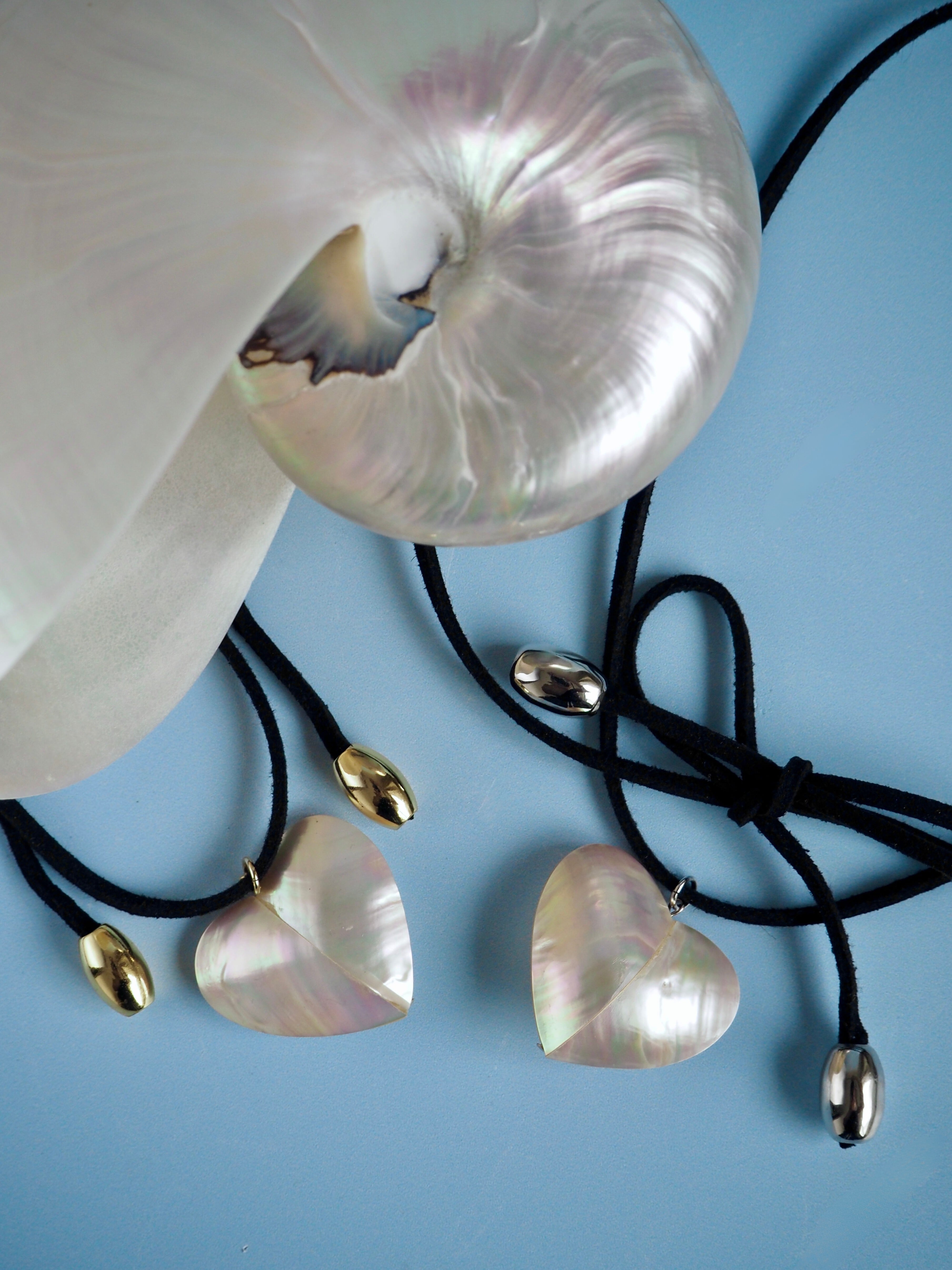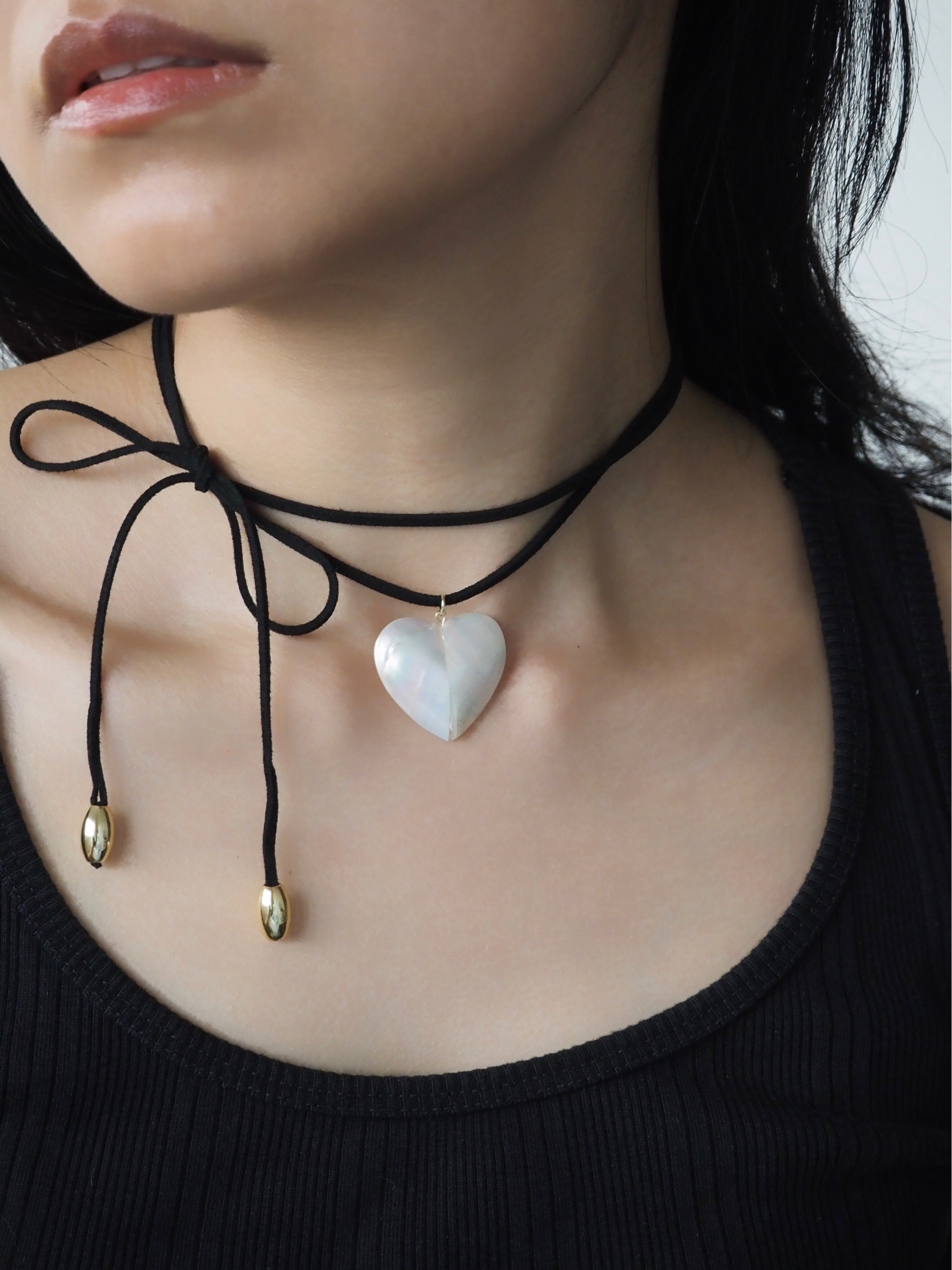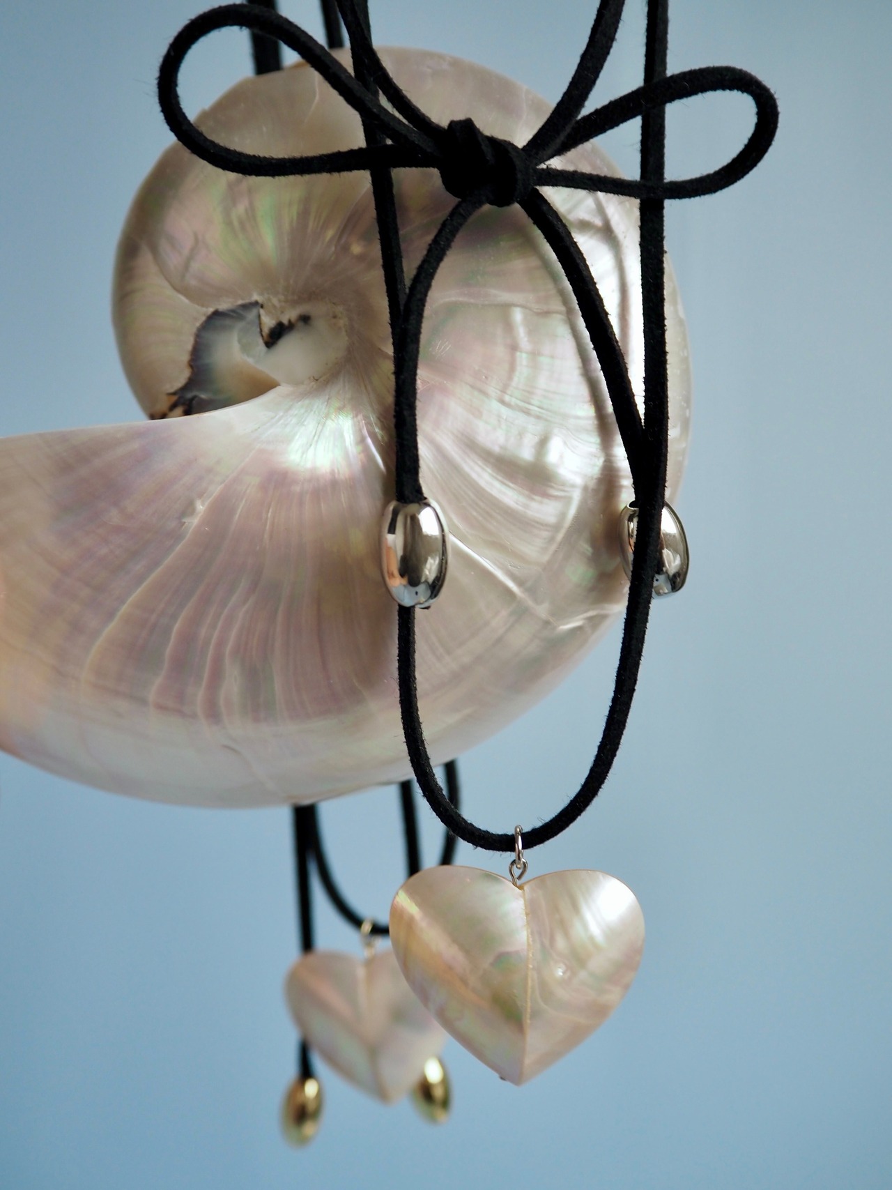 オウムガイの殻を真珠層まで丁寧に磨き上げ、ハート型に加工したチャームが揺れるチョーカーです。