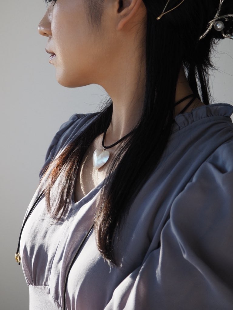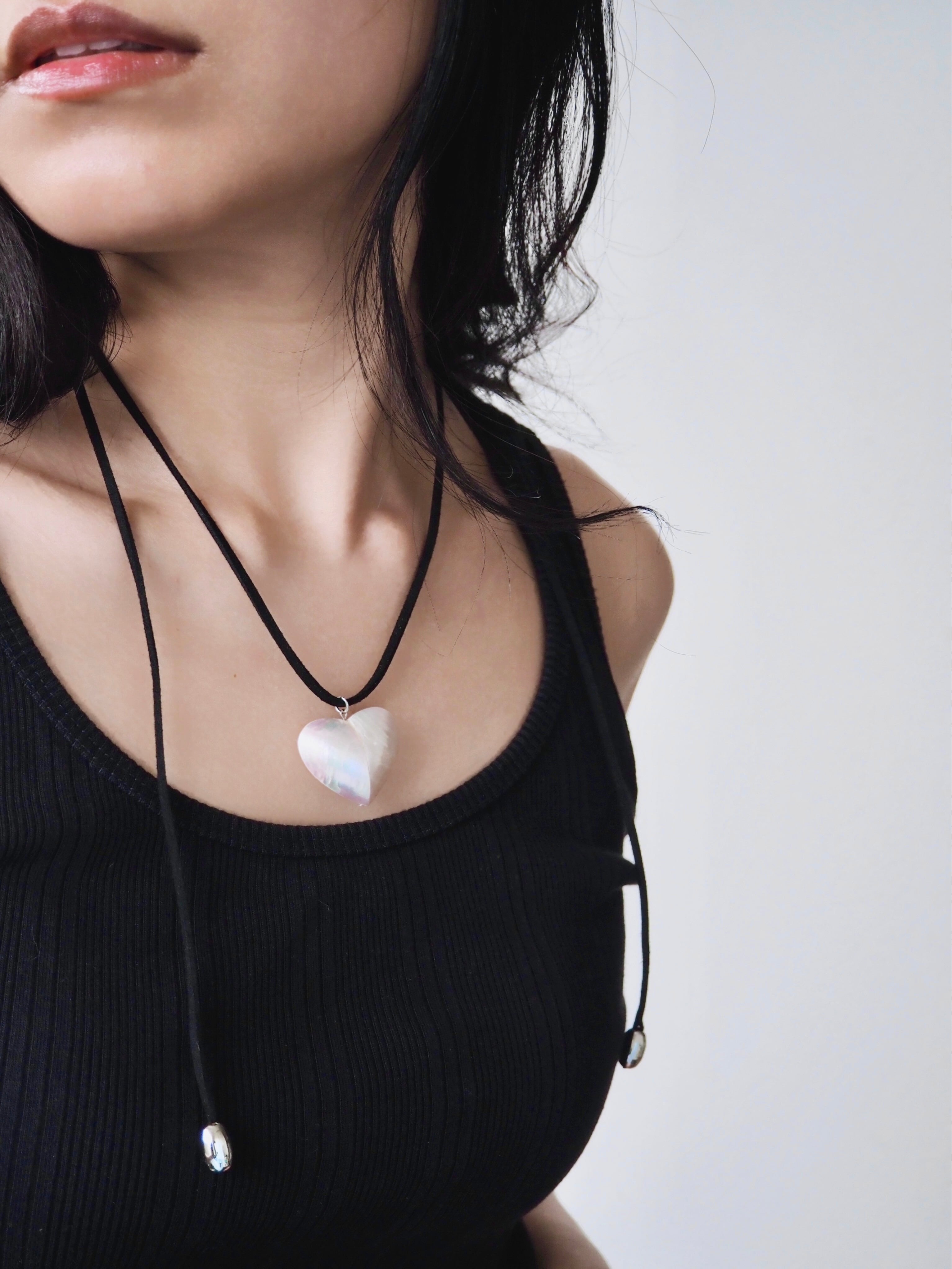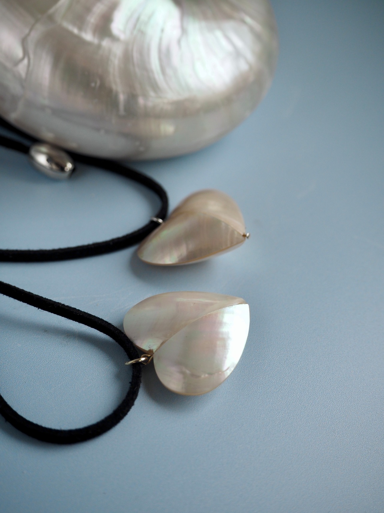 オウムガイの殻を真珠層まで丁寧に磨き上げ、ハート型に加工したチャームが揺れるチョーカーです。