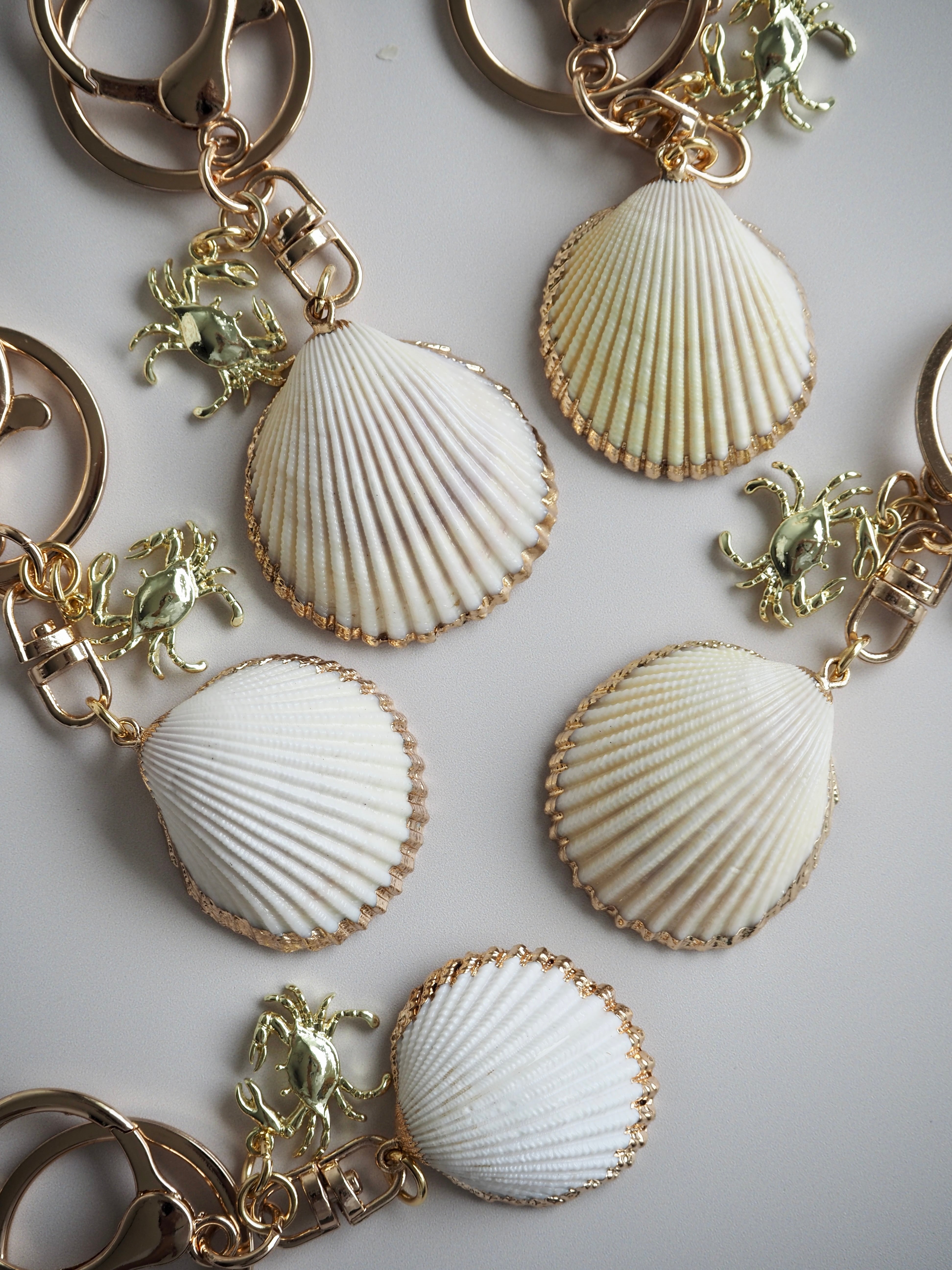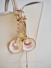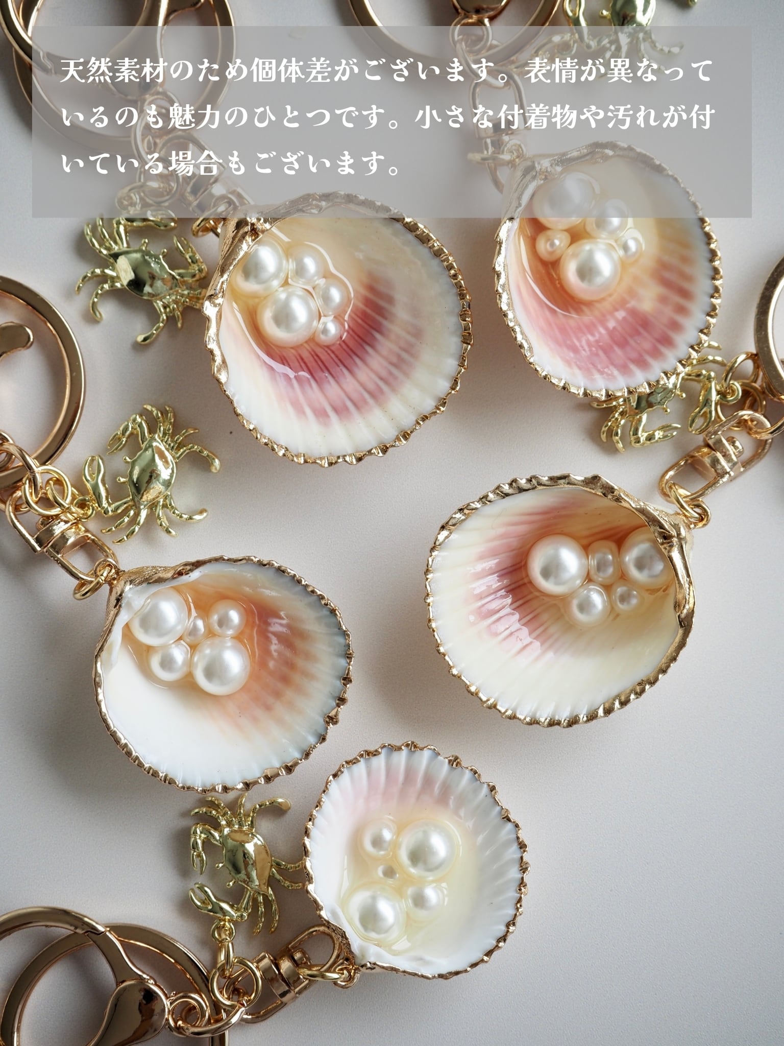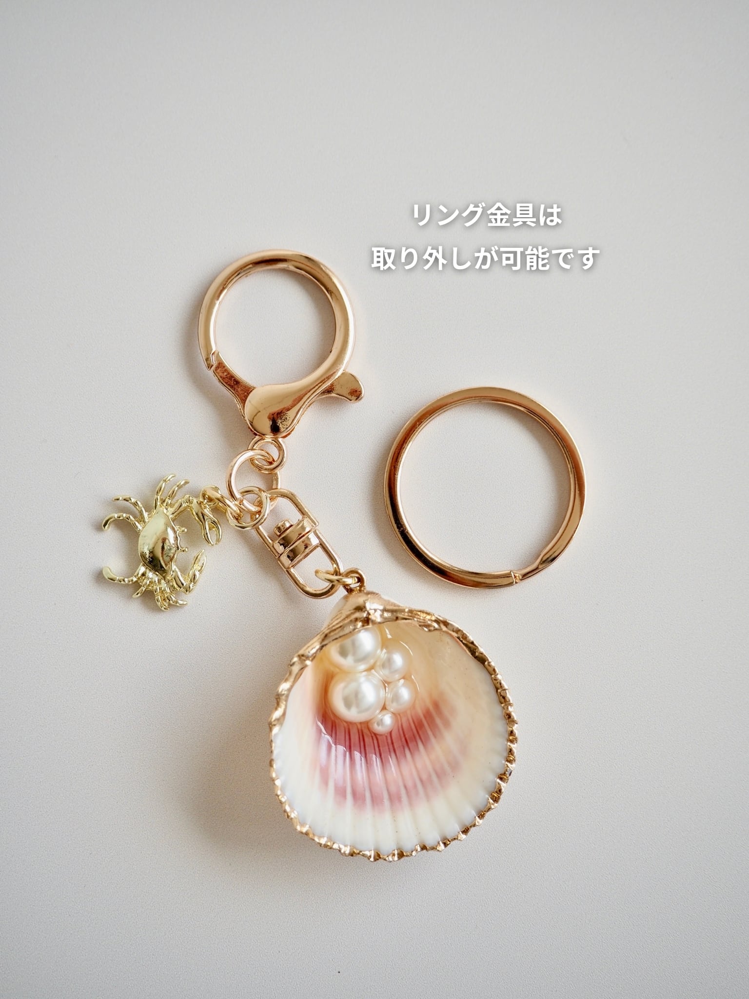 天然色の色合いと模様が美しい二枚貝に、ピンノをイメージしたカニチャームを合わせたバッグチャームです。