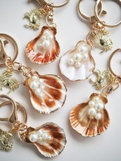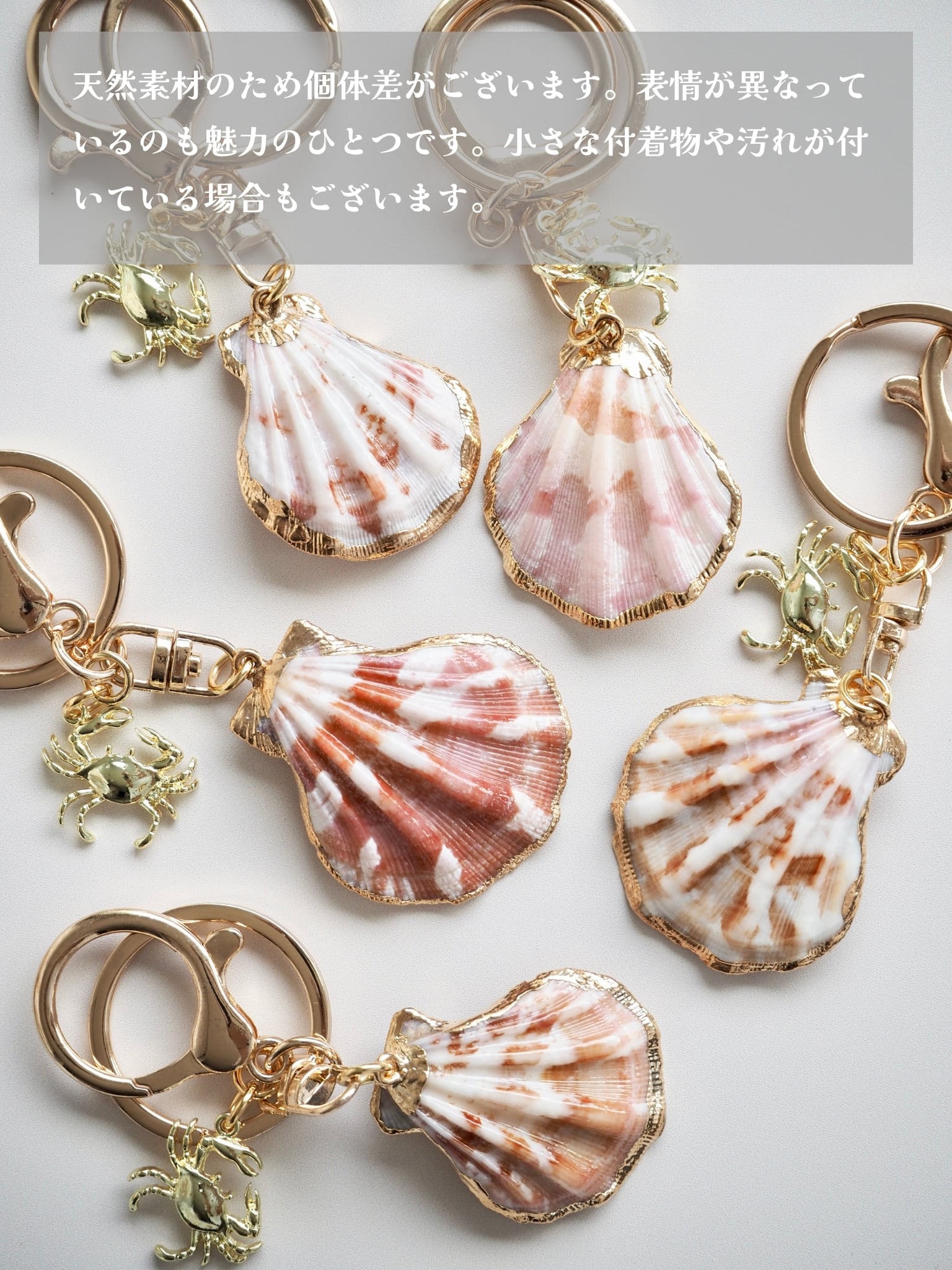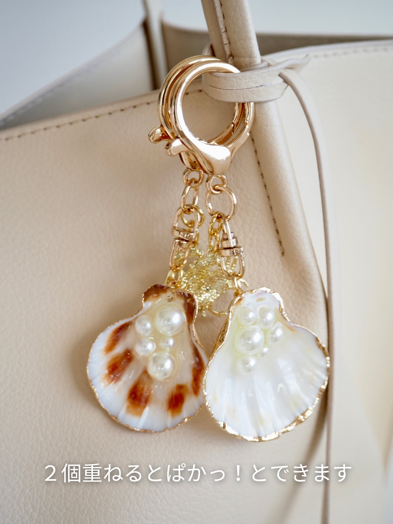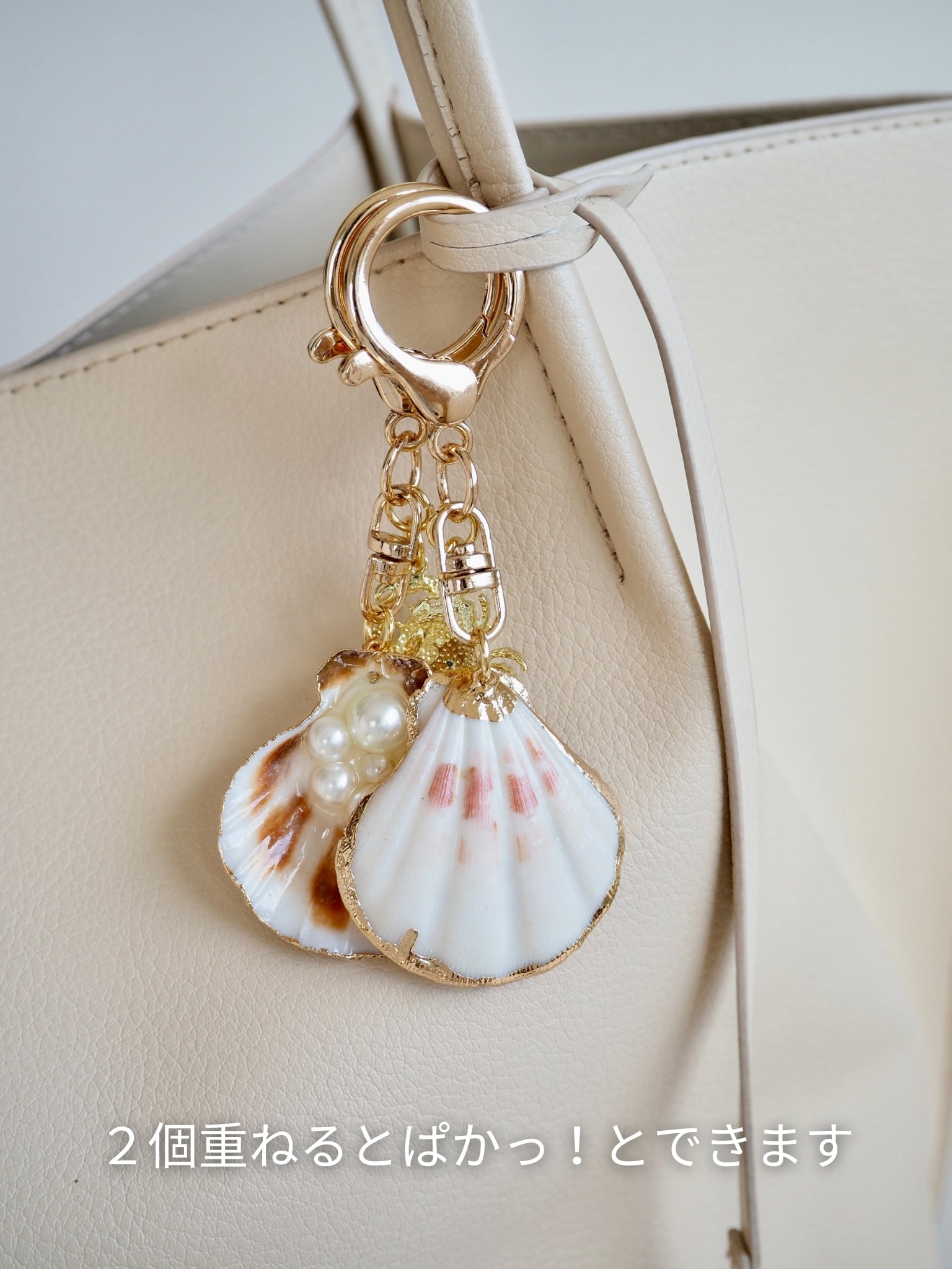 天然色の色合いと模様が美しい二枚貝に、ピンノをイメージしたカニチャームを合わせたバッグチャームです。