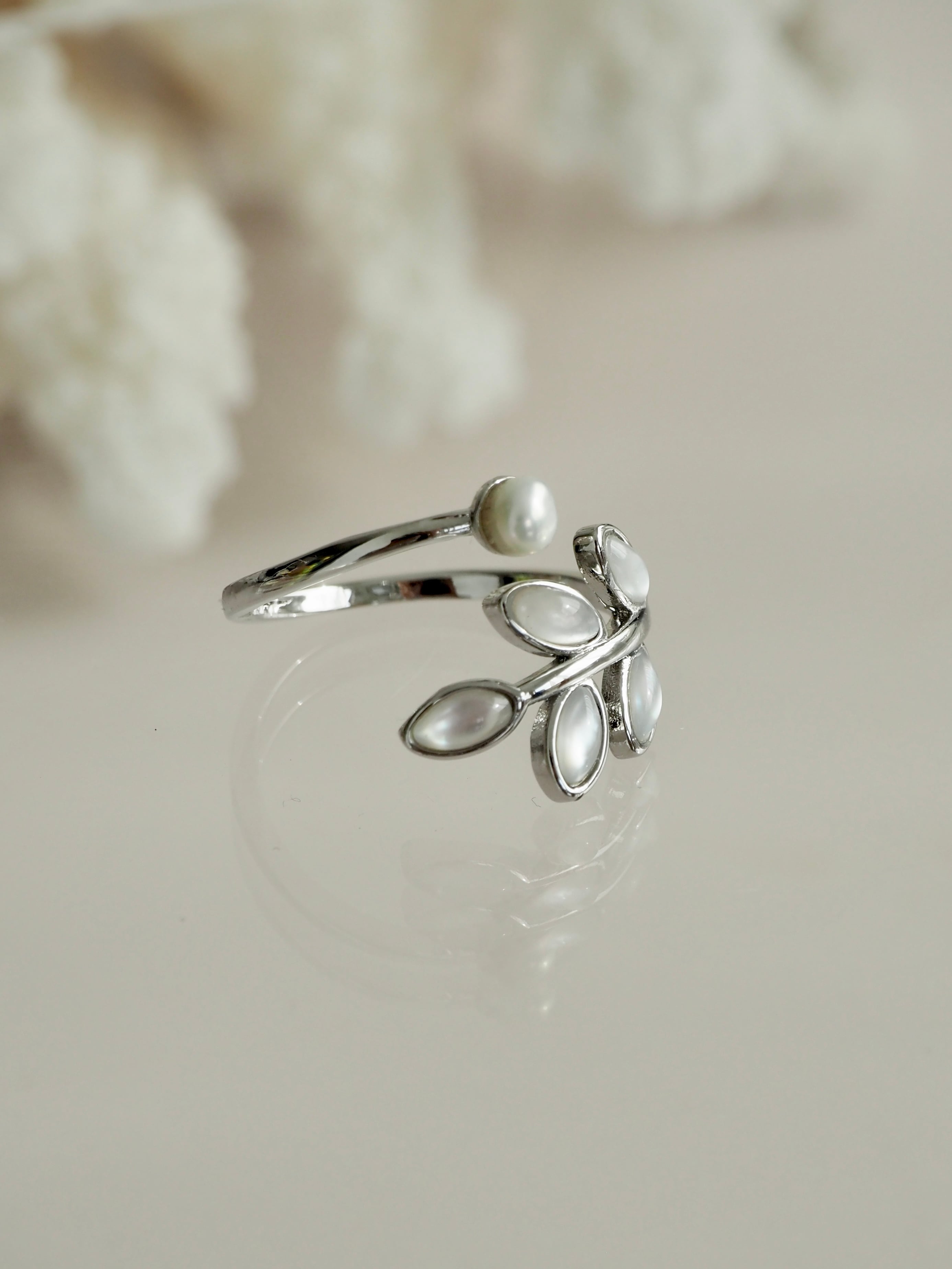 マザーオブパール(真珠母貝)のシロチョウガイに淡水パールを合わせたフリーサイズのリング。古くから平和と安らぎの象徴とされるオリーブのモチーフです。