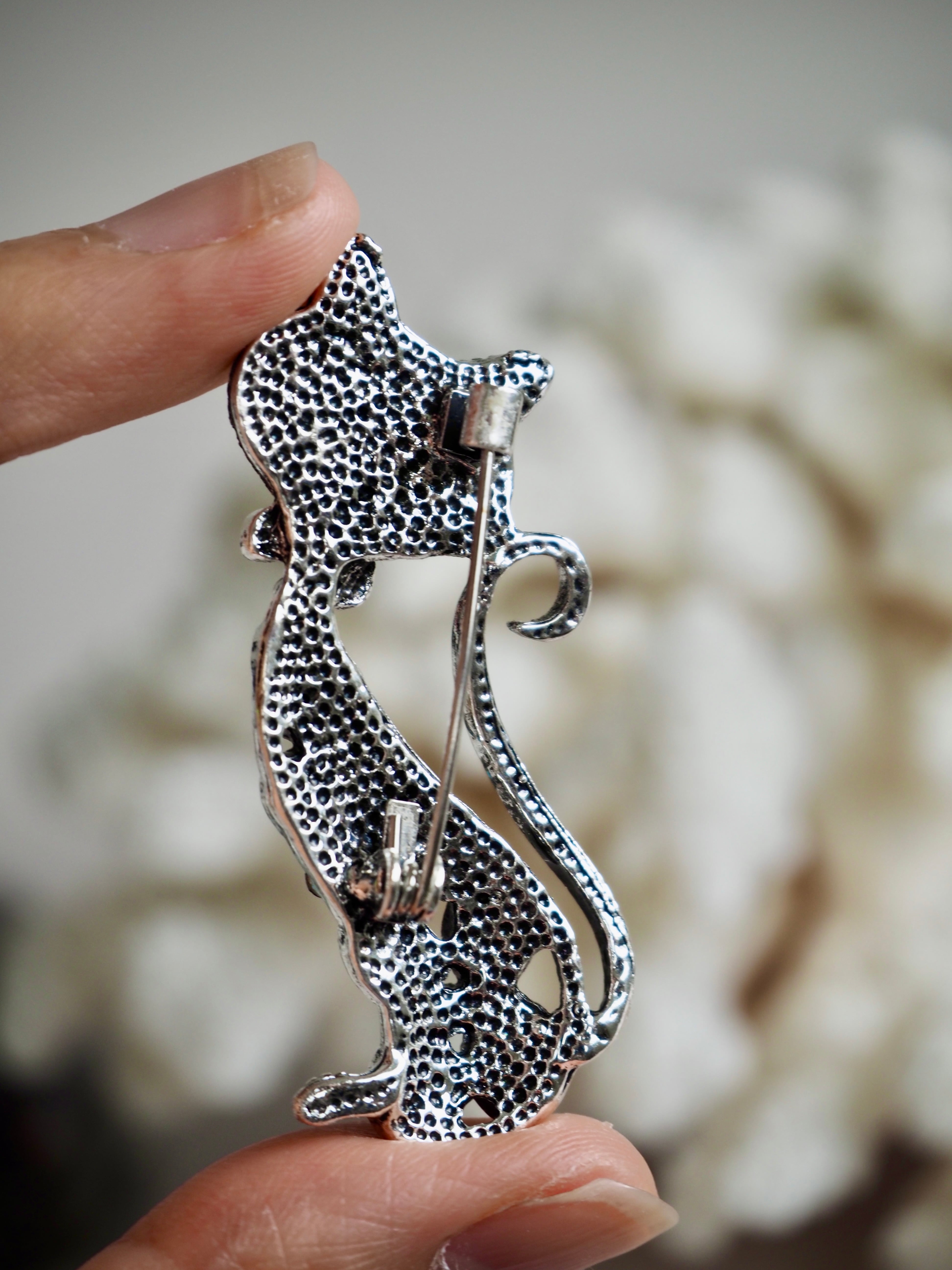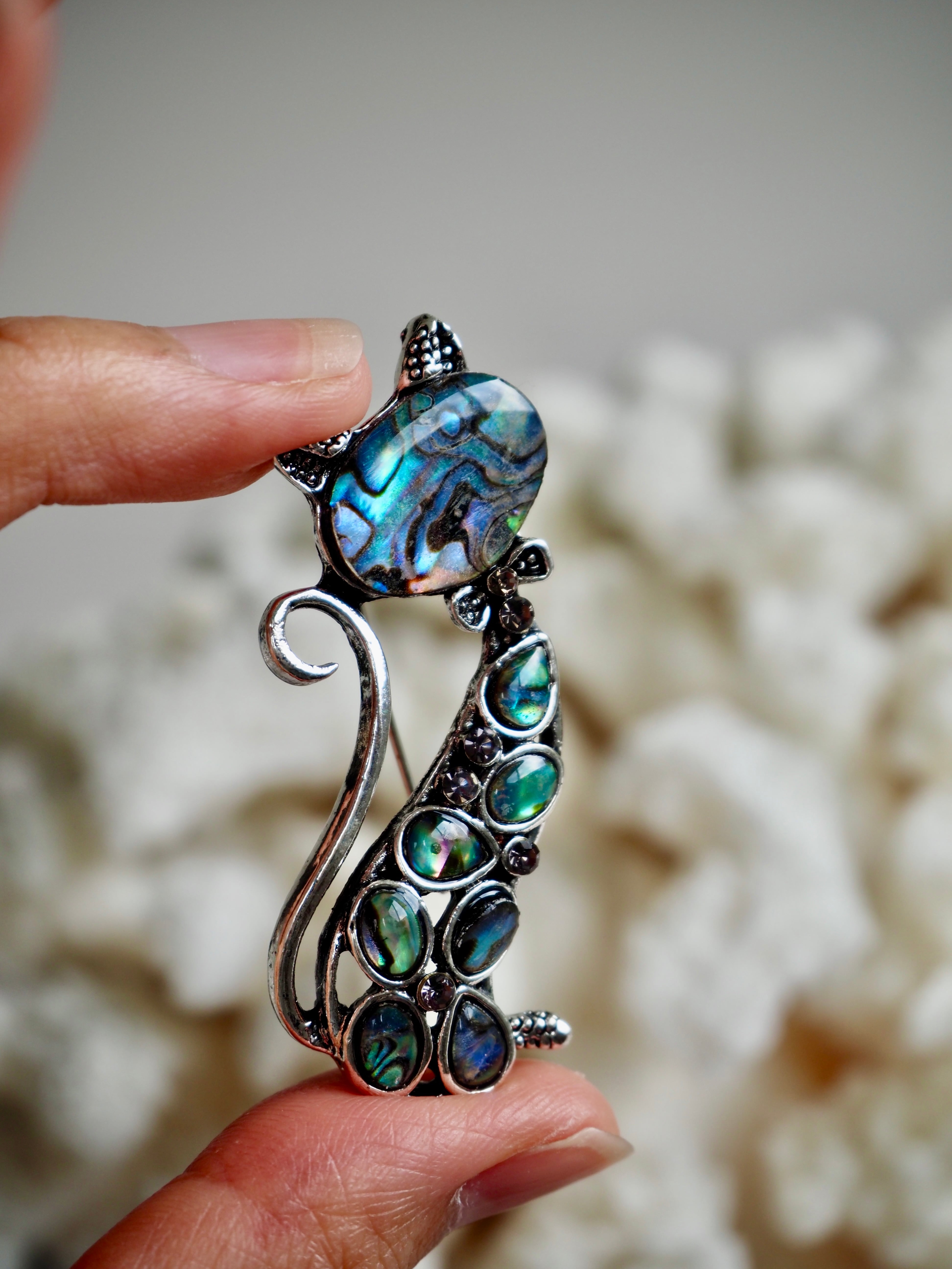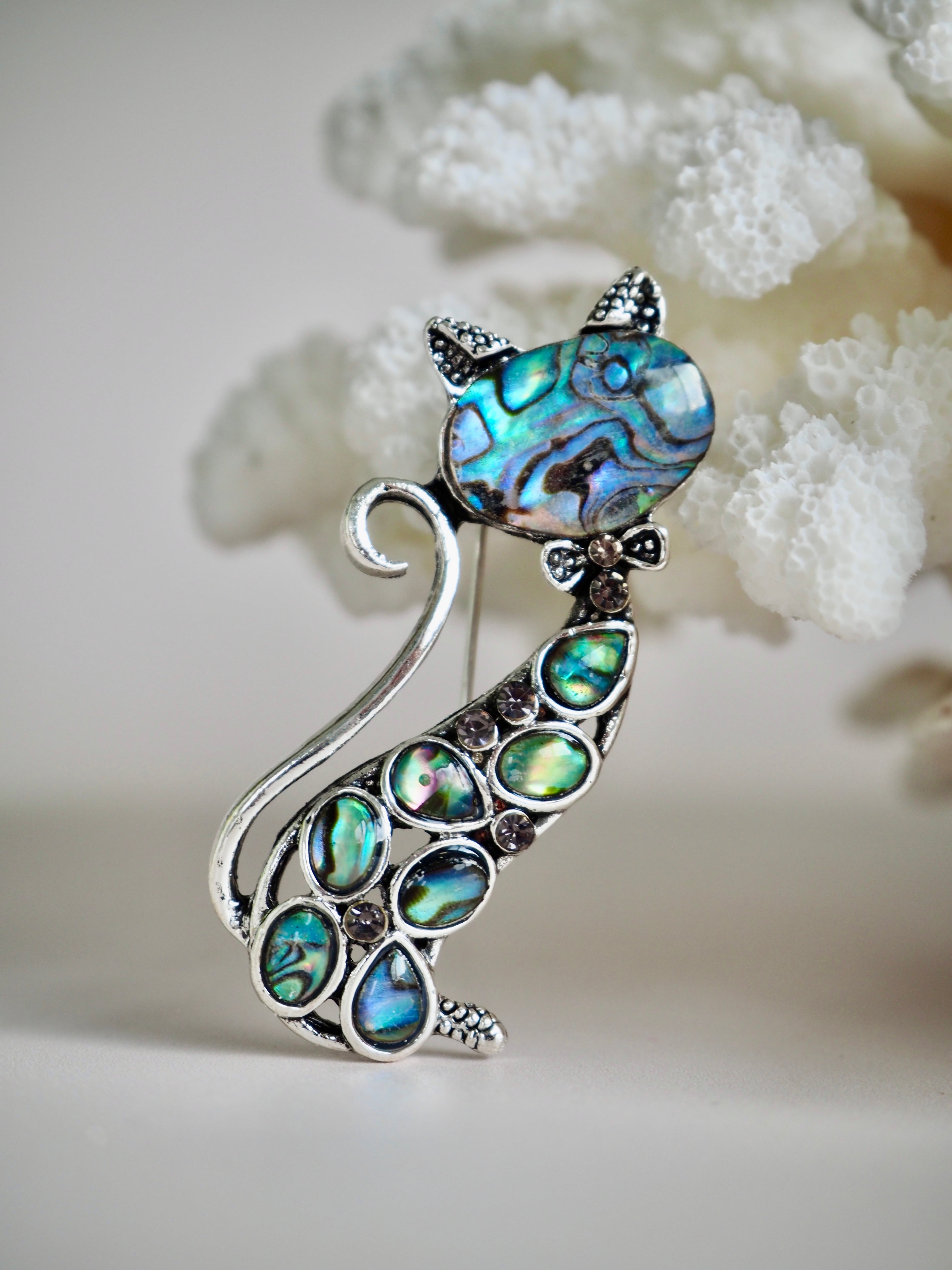 独特の虹色の輝きが美しく“海のオパール”とも呼ばれるパウアアバロン(ヘリトリアワビ)を使用したブローチ。くるんとした尻尾の先に幸運を引っかけてくる「かぎしっぽ猫」モチーフです。