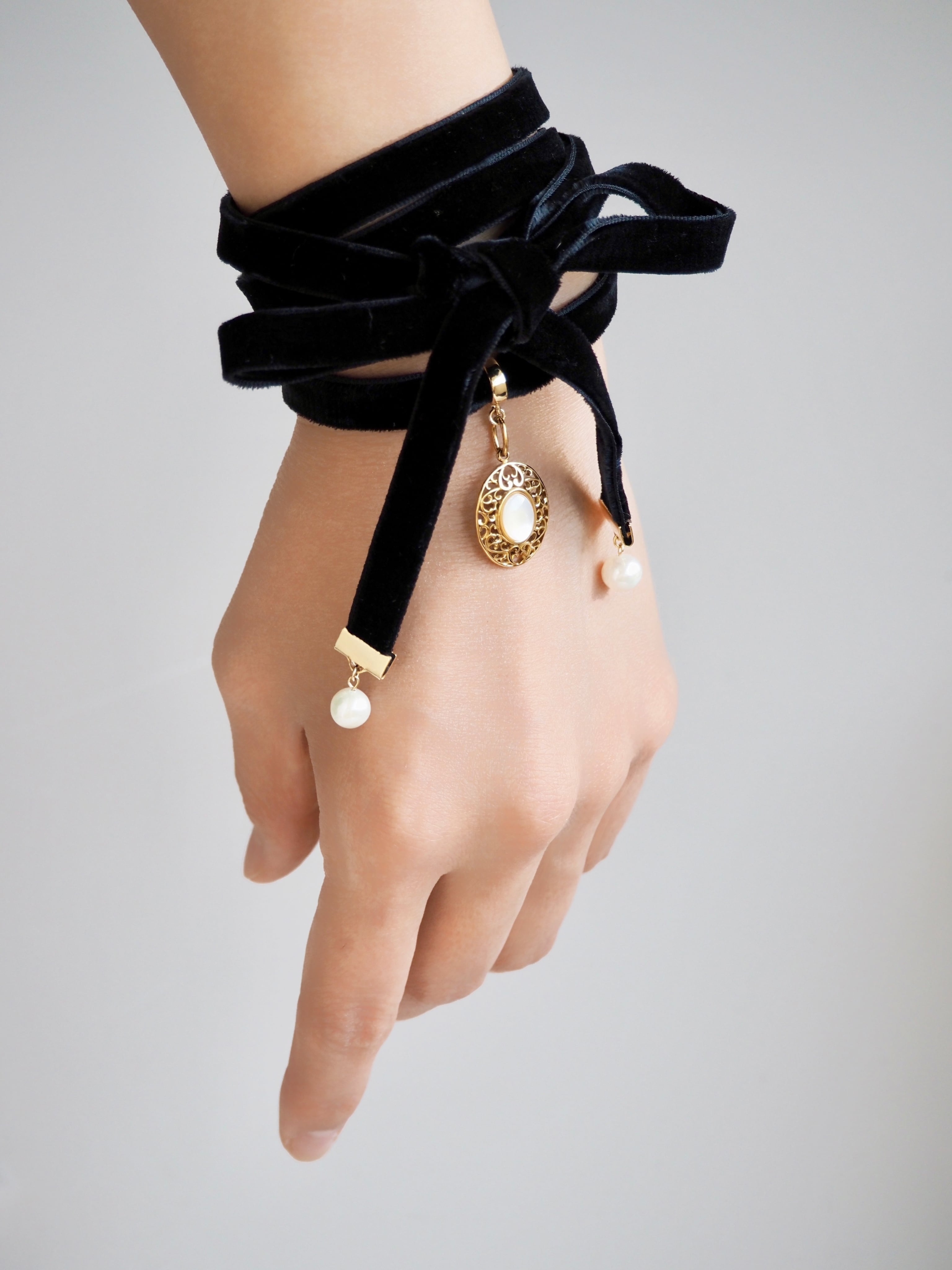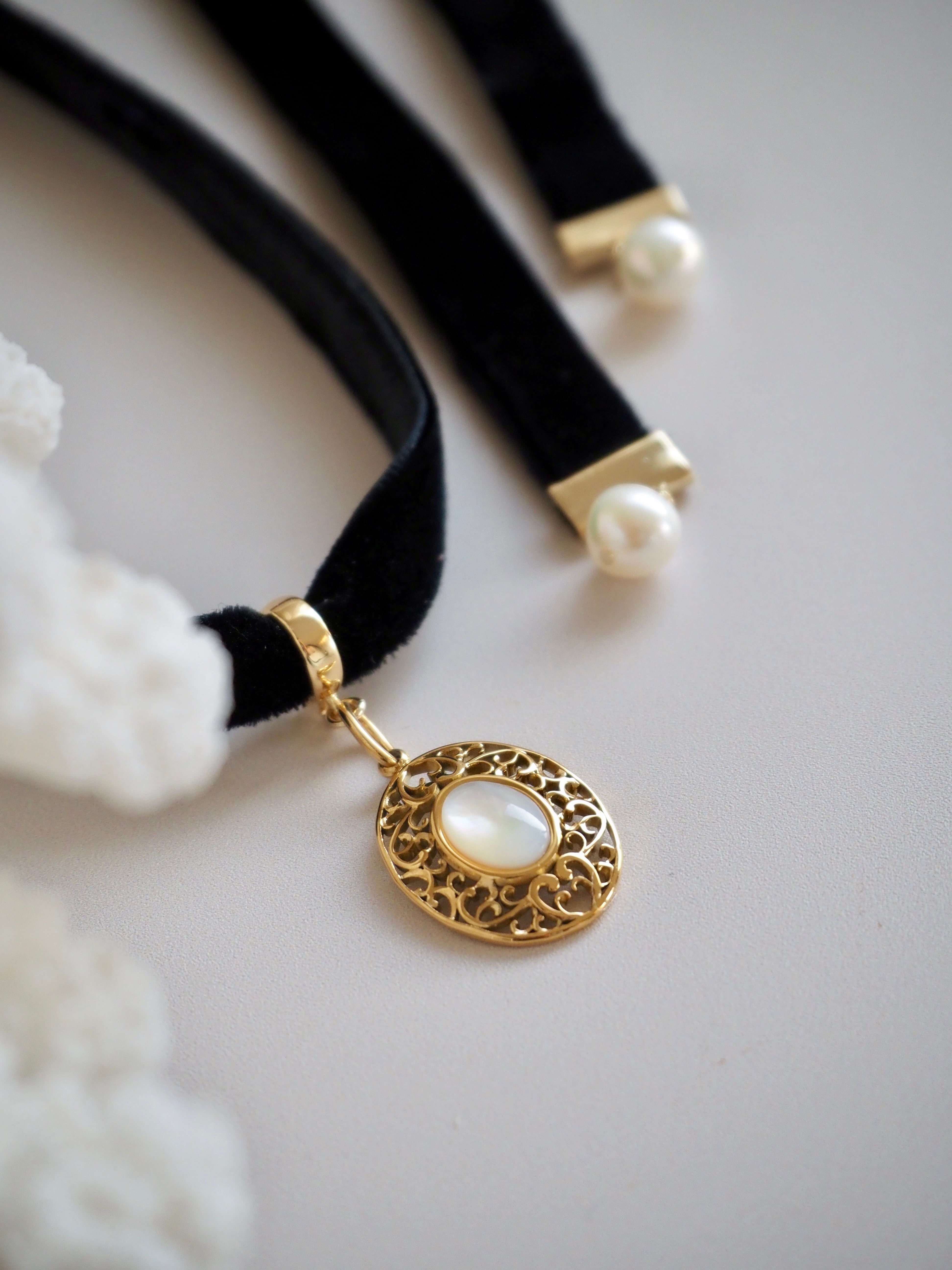 素材:シロチョウガイ、淡水パール、304ステンレススチール(14KGP金メッキ加工)、両面ベルベットリボン(ナイロン製)