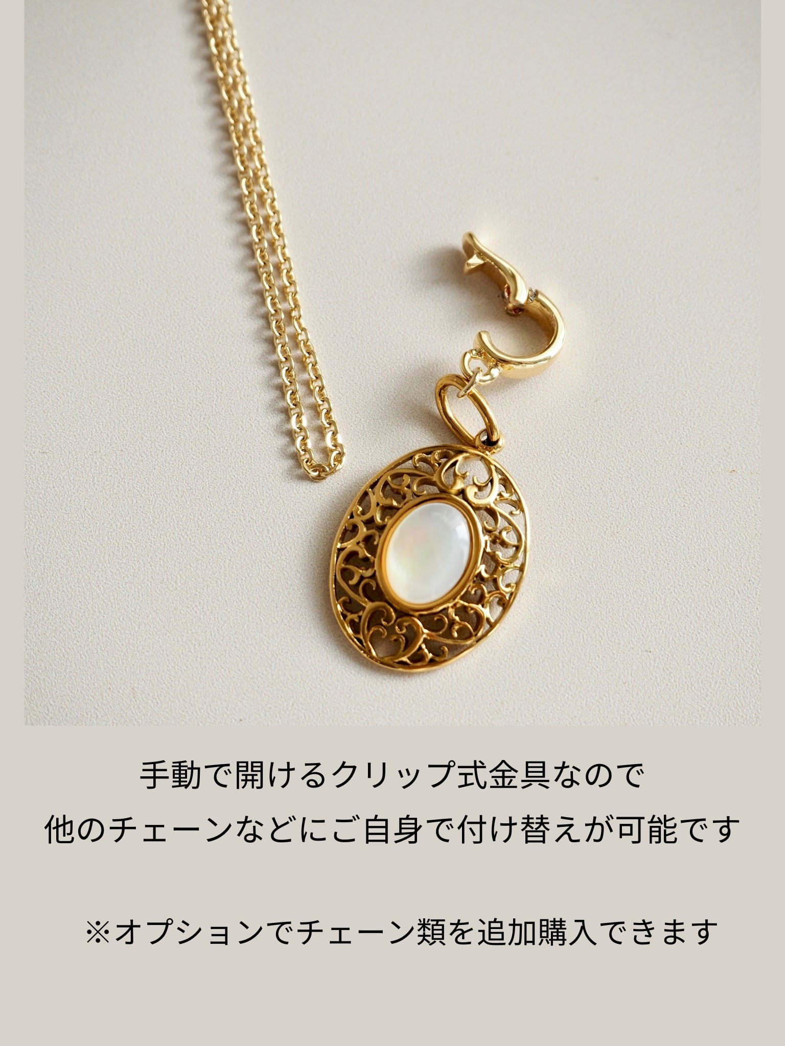 取り外し可能な金具なのでチェーンへの取り換えも可能です。
