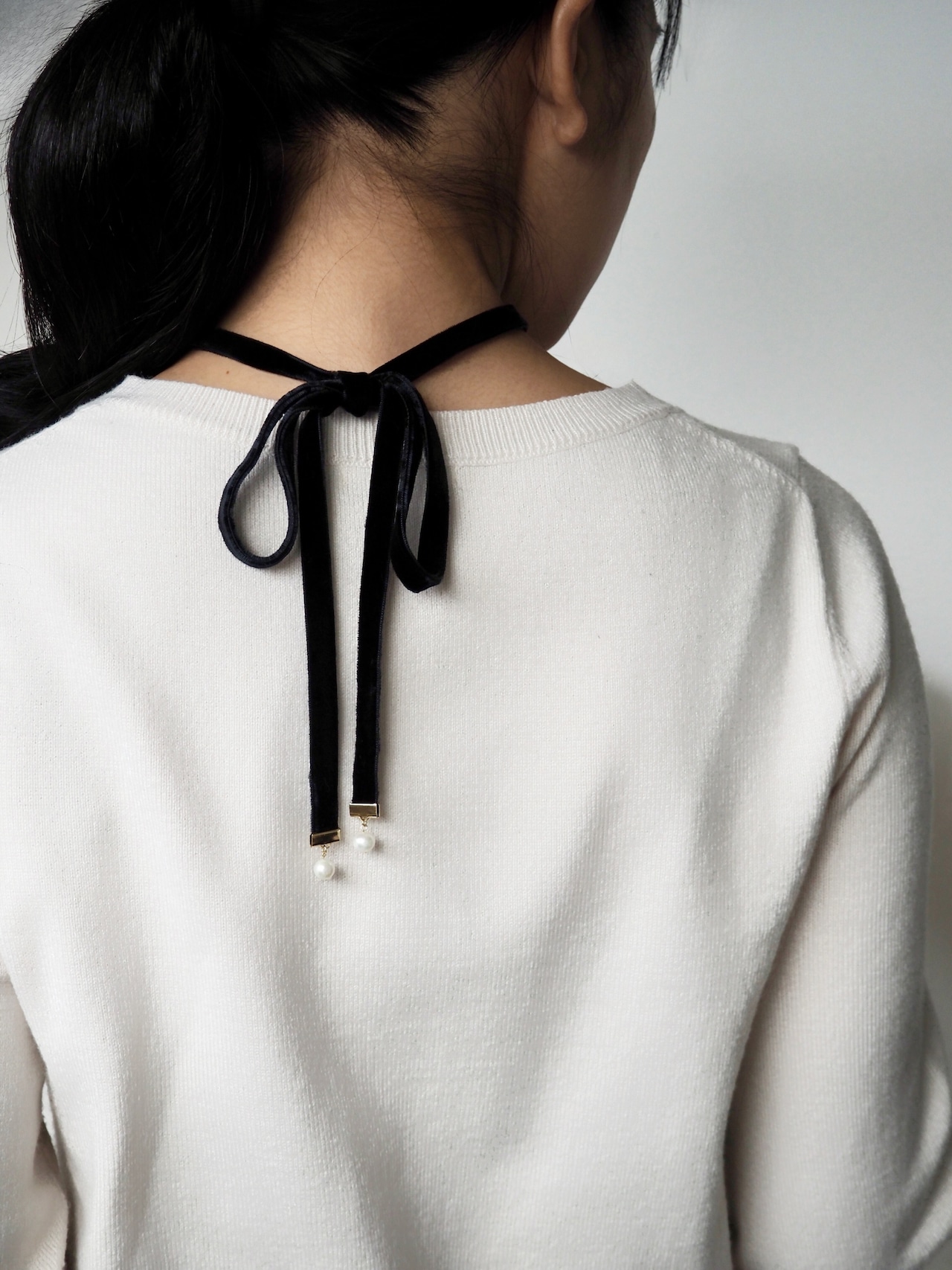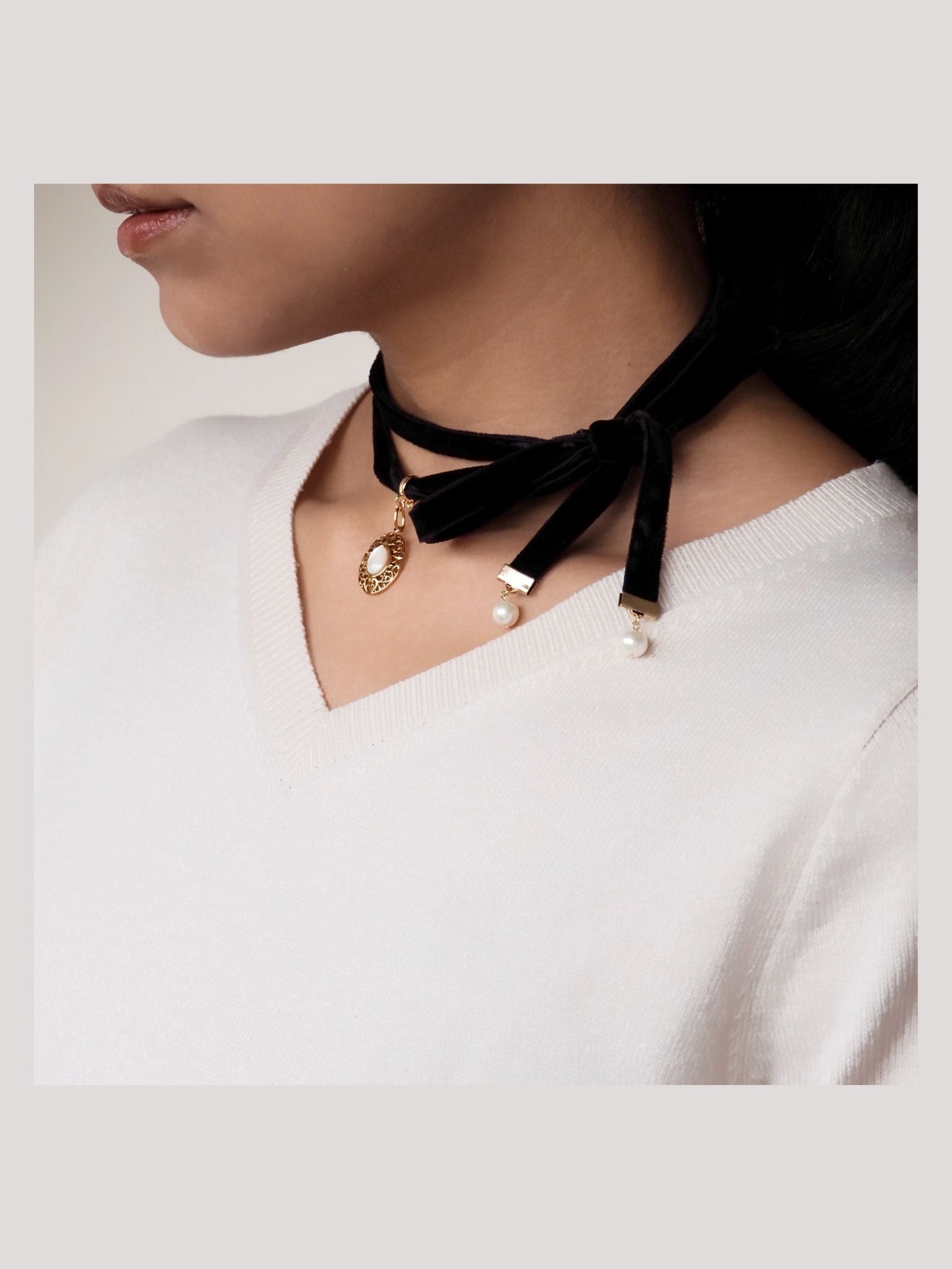 リボンは軽やかで肌当たりも優しく柔らかな両面ベルベットを使用。結び方を変えることで、チョーカーとしても、短めのネックレスとしても自由にアレンジ可能。あなたらしいスタイルでお楽しみいただけます。