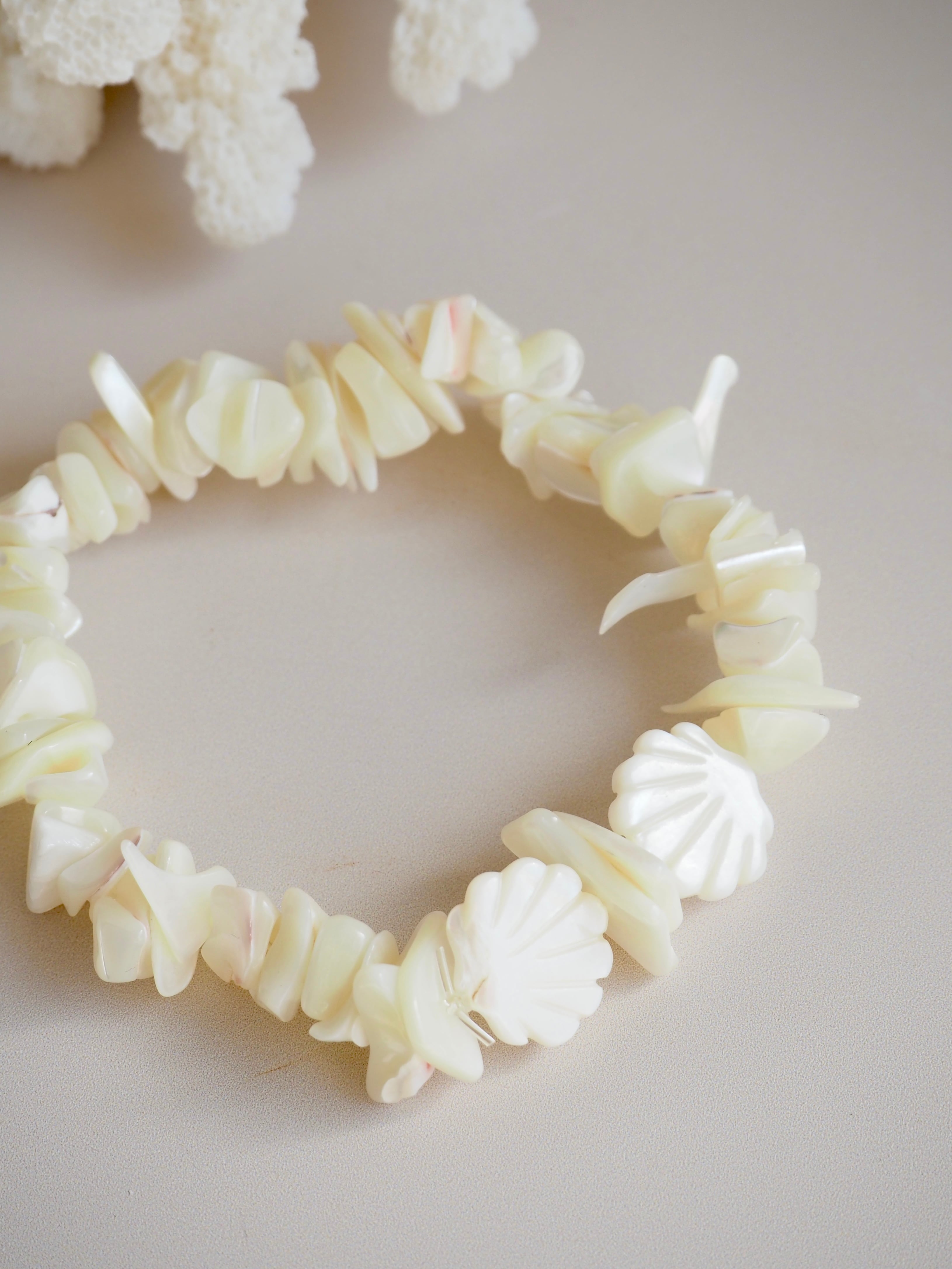 素材:タカセガイ(さざれ)、淡水真珠貝(二枚貝ビーズ)、テグス