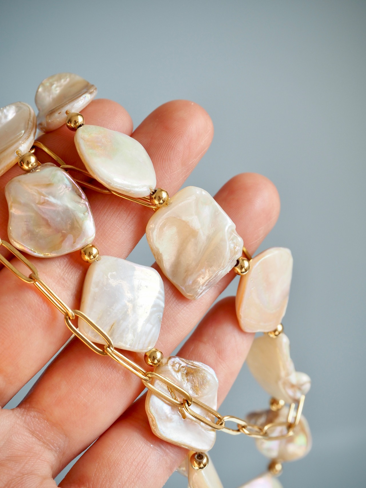 その真珠貝の貝殻をカットし“カケラ”として連ねた二連ネックレス。