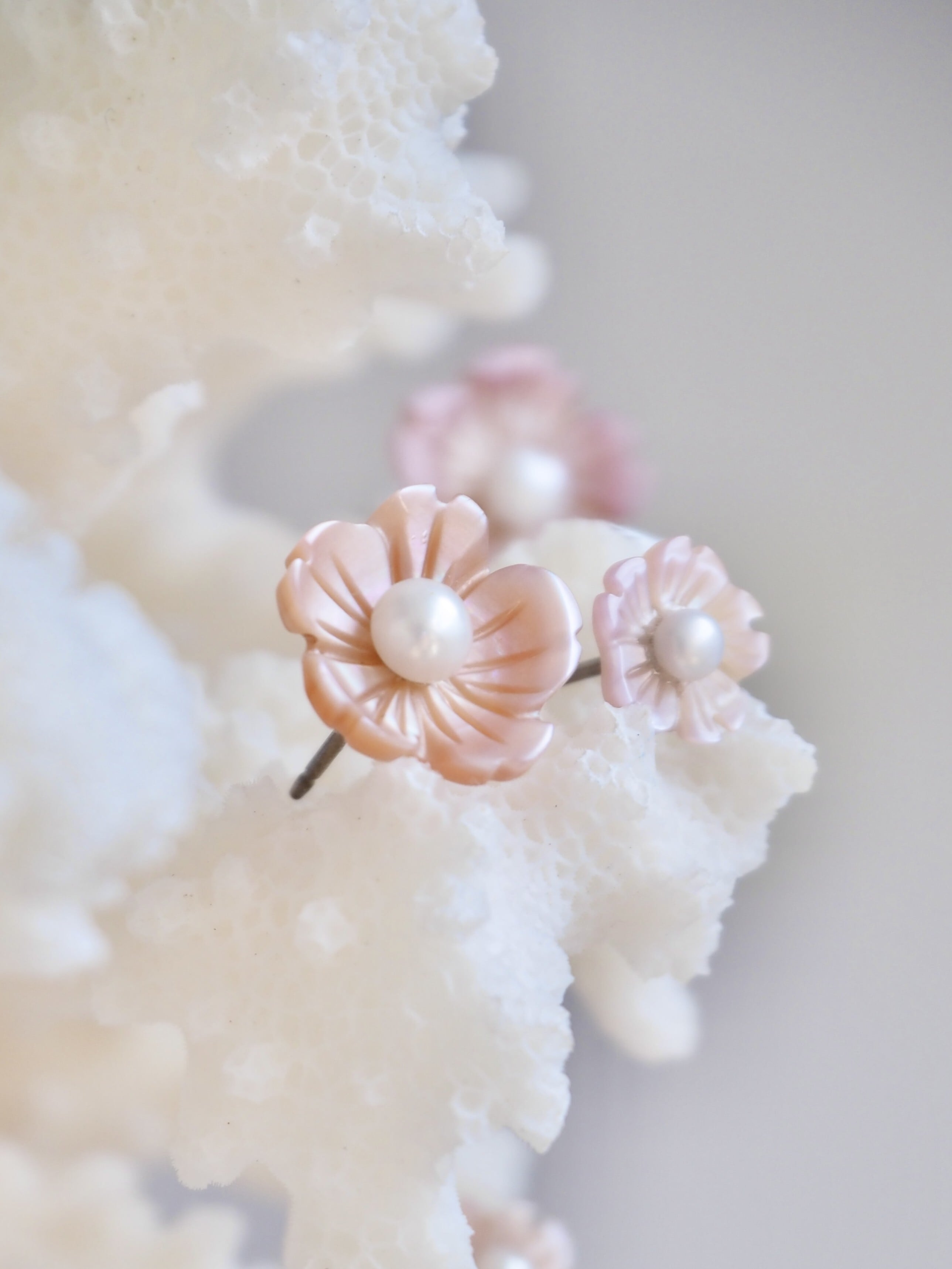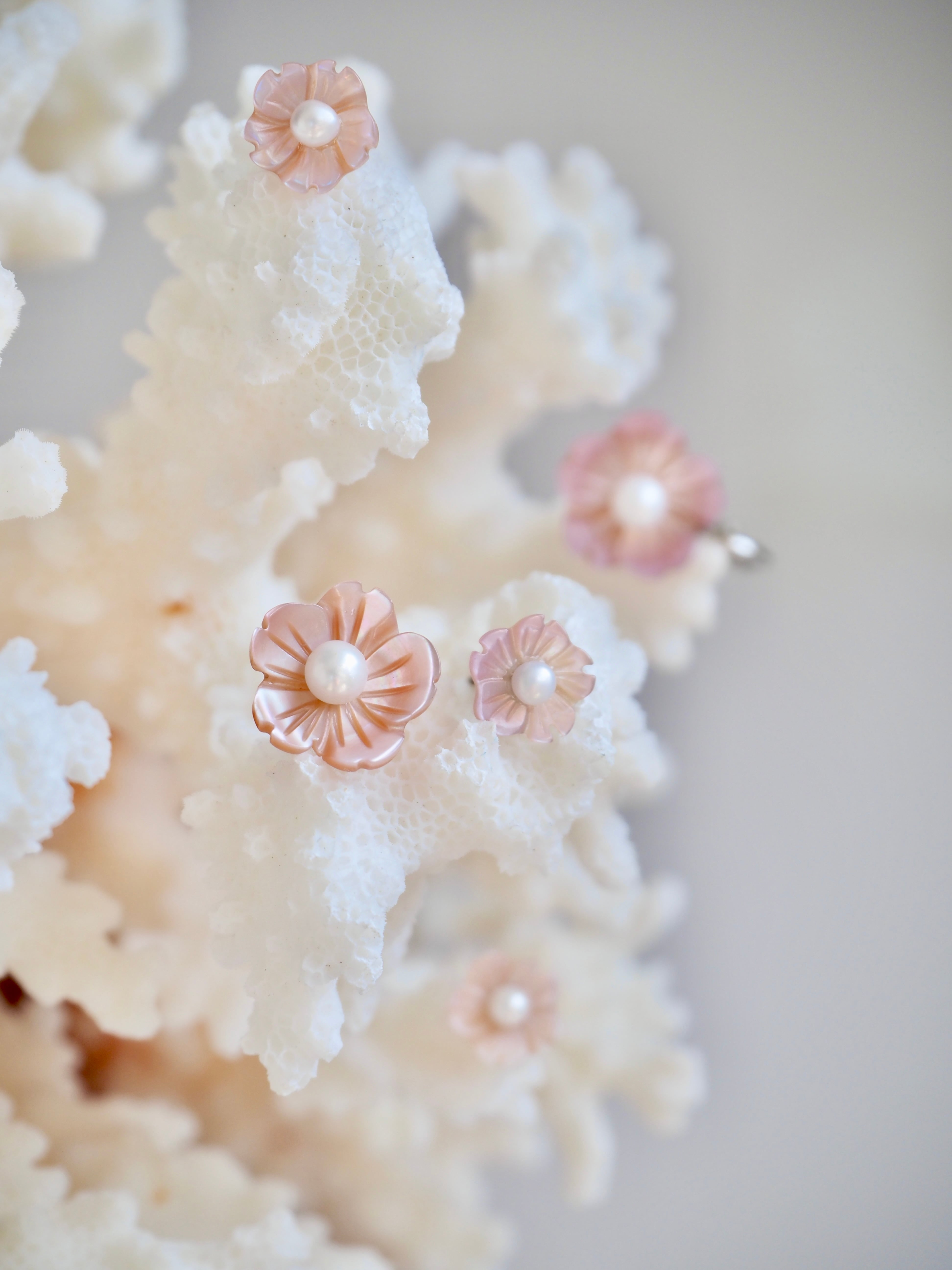 柔らかなピンク色は染色無しの自然由来。淡水パールの母貝であるイケチョウガイ属の貝殻を使用した耳飾りです。貝殻自体にも真珠同様の光沢と輝きがあります。