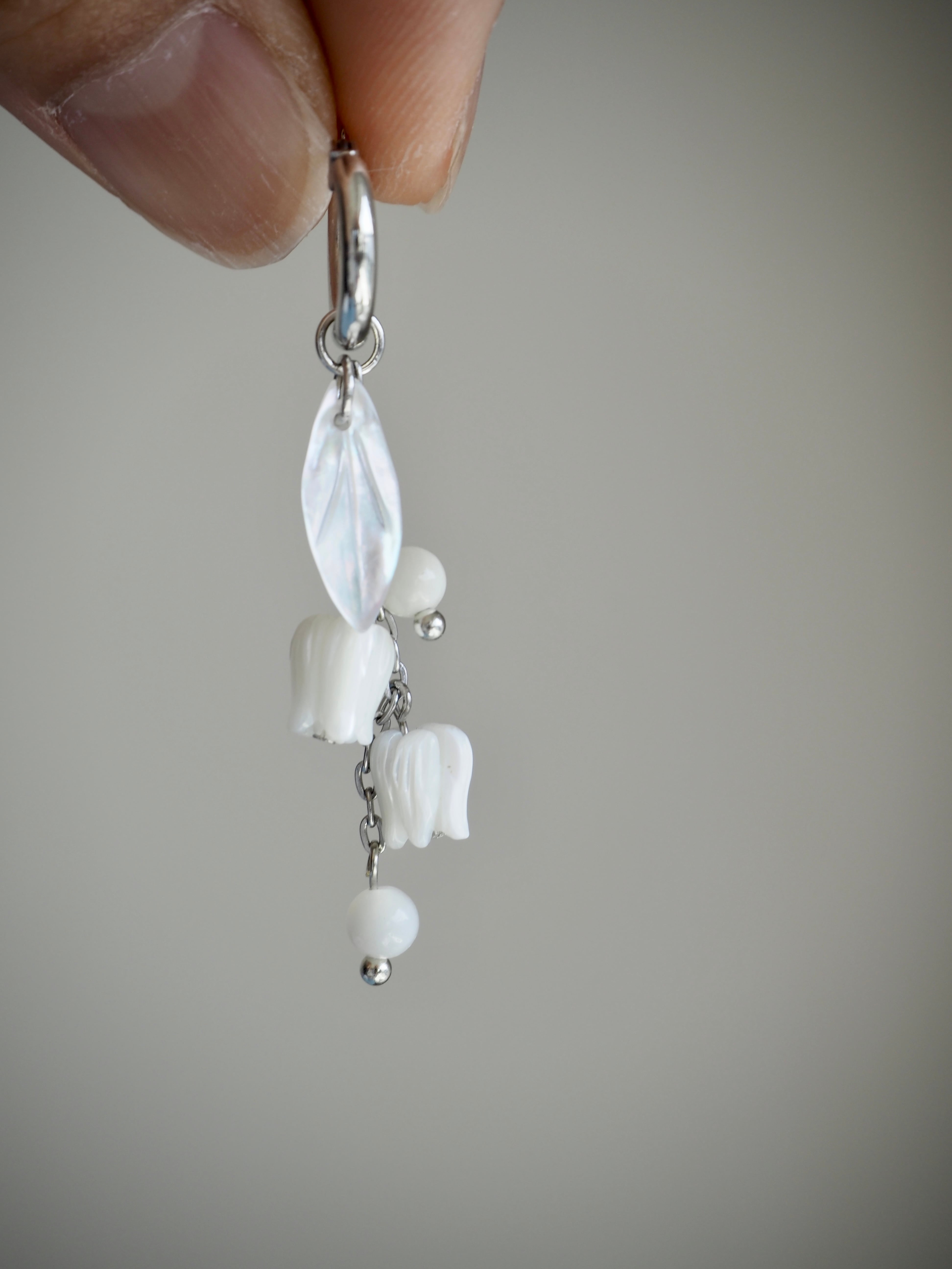 素材:シロチョウガイ(葉部分)、タカセガイ(スズランと球ビーズ)、ステンレスチェーン