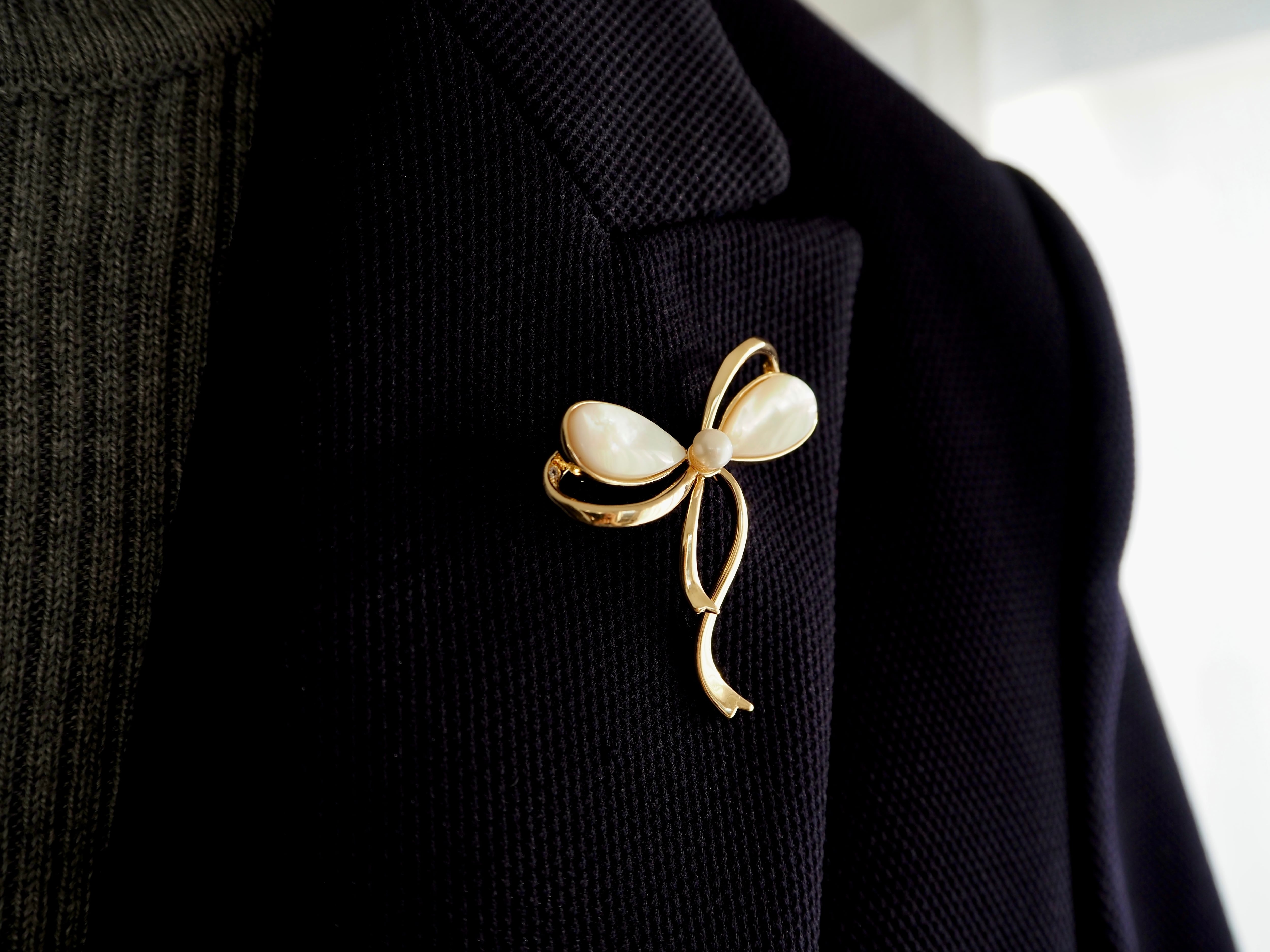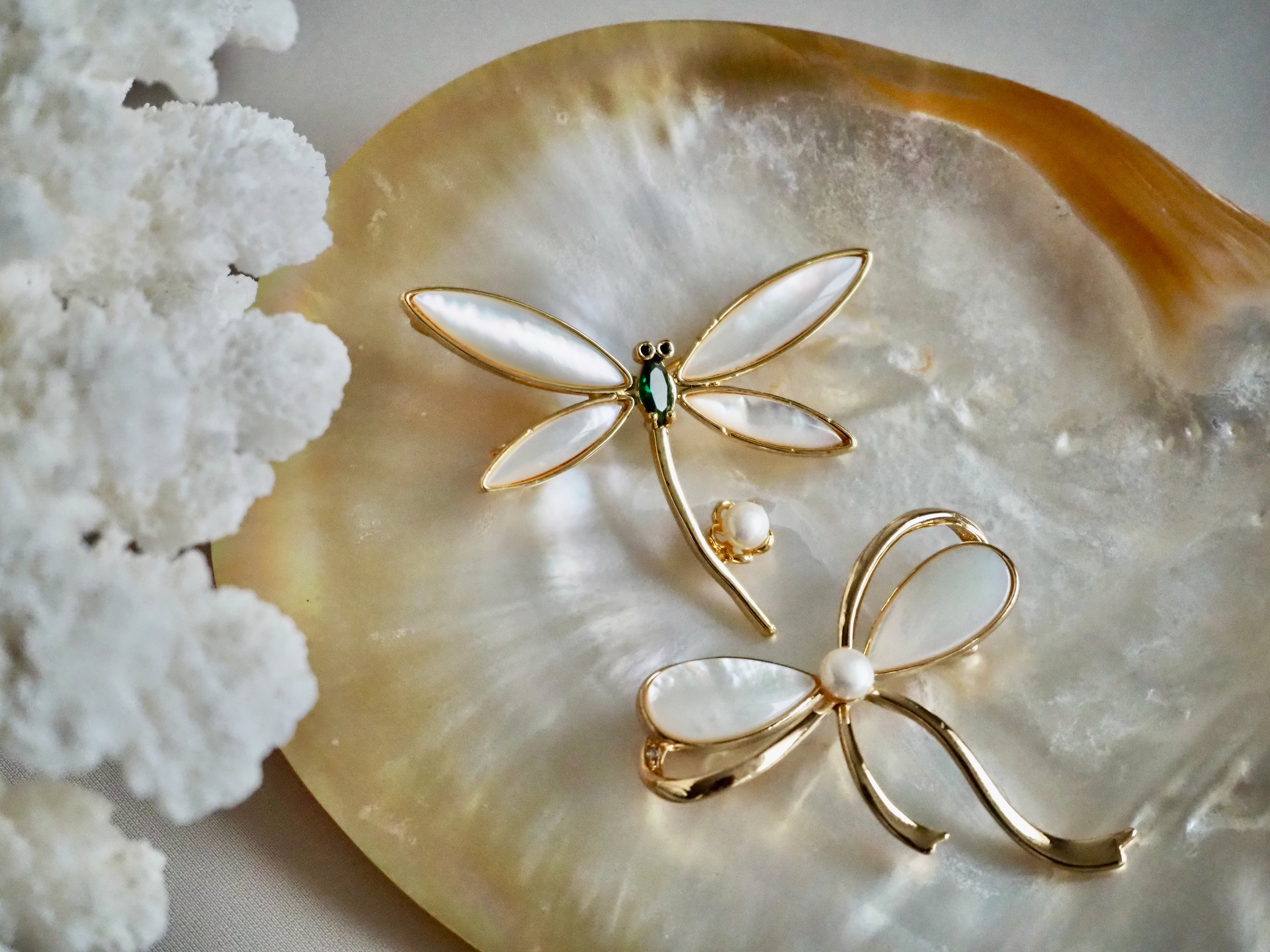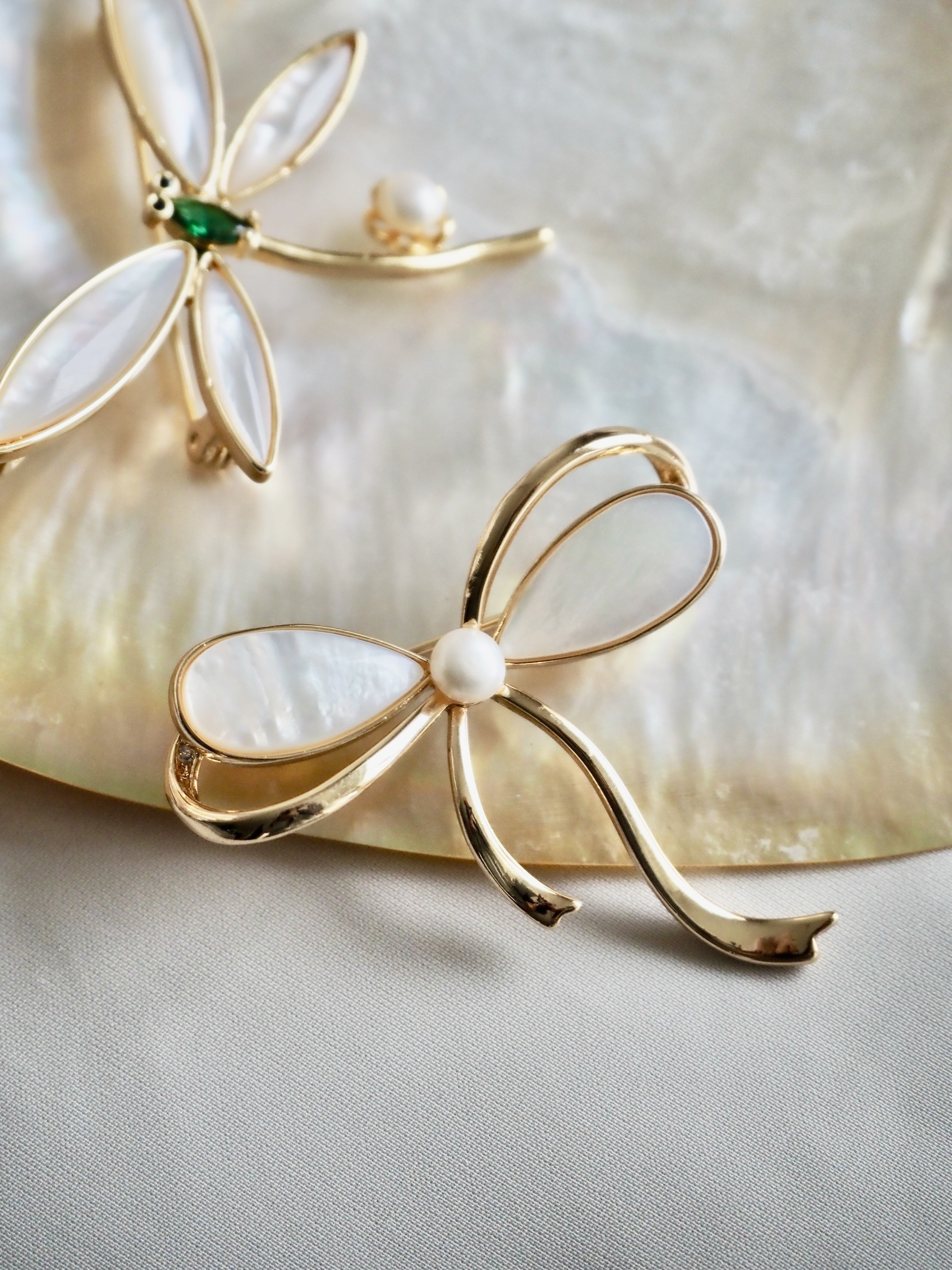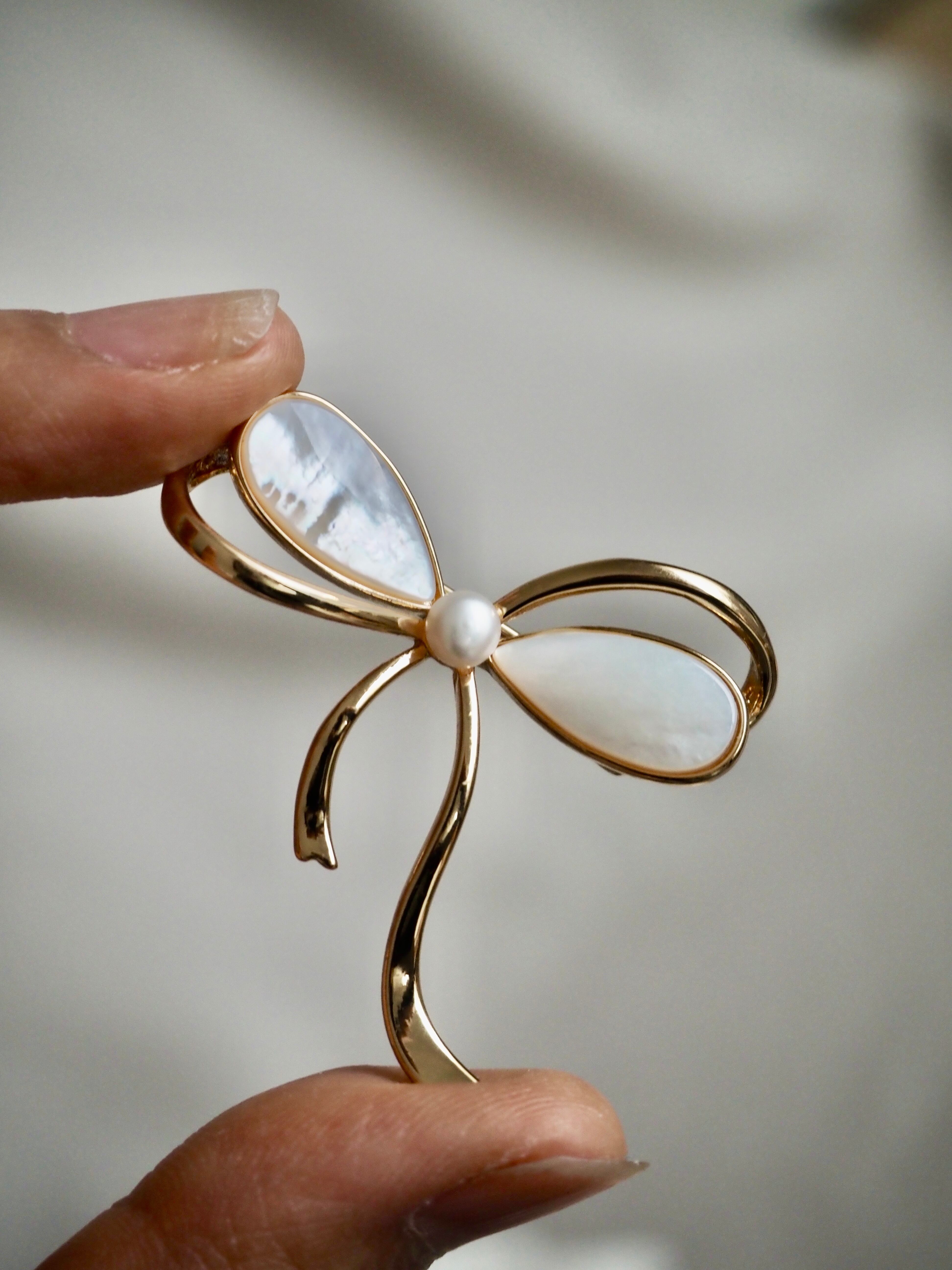 貝殻リボンブローチ シロチョウガイと淡水パール