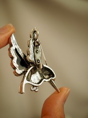 独特の虹色の輝きが美しく“海のオパール”とも呼ばれるパウアアバロン(ヘリトリアワビ)を使用したブローチ。モチーフは「飛ぶ宝石」と呼ばれるカワセミです。