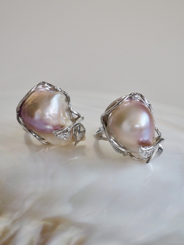 ※実際にお送りするのは写真2枚目以降の現品です。 自然の中で生まれた、かけがえのない造形美。 個性豊かな形状のバロックパールを牡蠣のように仕立てたリングです。 近年人気のバロックパール。同じものはこの世にふたつとなく、唯一無二の愛らしさが注目を集めています。バロックとはポルトガル語の「バロック(いびつ)」が語源とされています。 その不規則なフォルムこそが自然の贈り物。 真珠ならではの優しい艶と光沢が手元を上品に彩ります。 素材:淡水パール、真鍮(プラチナメッキ) 学名:Hyriopsis schlegeli サイズ:約11~13号フリーサイズ(ご自身で調整が可能です) ※天然素材のため同じ形状、色味の物はありません。表情が異なっているのも魅力のひとつです。 ※模様や色味については当店のお任せになります。 ※モニターの関係や撮影時による光加減で、実物と画像の色合いが異なる場合があります。 □お手入れについて 貝殻の主成分は炭酸カルシウムです。酸によって溶けて表面が曇るなどの変化があるため、汗(弱酸性)が付着した際は水で優しく手洗いしてください。洗剤を使用する際は中性洗剤をご使用ください。